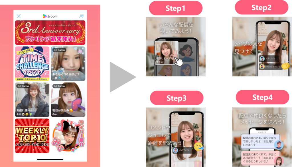 Jルームでは、リアルタイムでライバーさんと楽しく交流できる、新感覚の出会い体験が待っています!